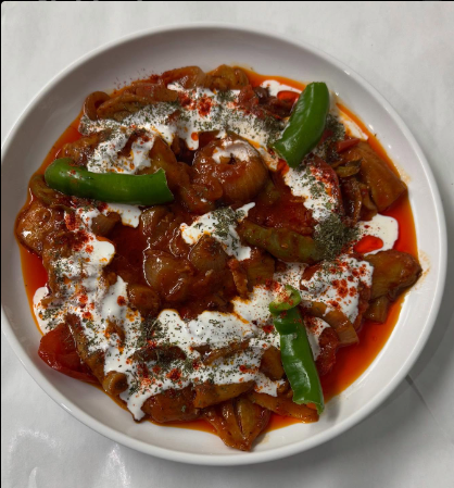 Stir fried eggplant topped with our homemade white sauce and tomato gravy.